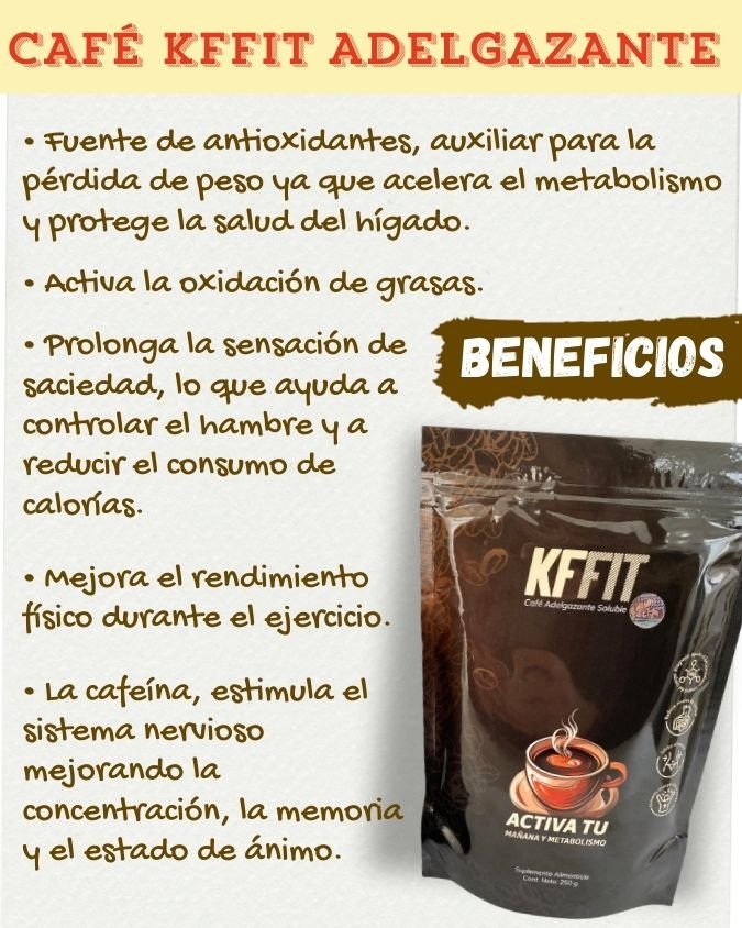 KFFIT es una fuente de antioxidantes, auxiliar para la pérdida de peso ya que acelera el metabolismo y protege la salud del hígado. Nuestro café activa la oxidación de grasas, reduce el apetito, prolonga la sensación de saciedad, lo que ayuda a controlar el hambre y a reducir el consumo de calorías. Mejora el rendimiento físico durante el ejercicio, la energía y función mental. La cafeína, componente principal del café negro, estimula el sistema nervioso mejorando la concentración, la memoria y el estado de ánimo. A su vez mejora de la función cognitiva y previene enfermedades como diabetes tipo 2, enfermedades cardíacas y algunos tipos de cancer.